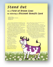 The good news is that there are ways for healthcare brokers to become purple cows, and as a result, see their bottom lines soar. One of those ways is to offer a discount benefit card for free or at a reduced rate to your clients' employees. These cards – which are not insurance – provide the holders with discounts on services that their employer may not offer. For example, a dental discount card may provide holders with 15-50* percent off services such as fillings and cleanings from thousands of dentists across the country.